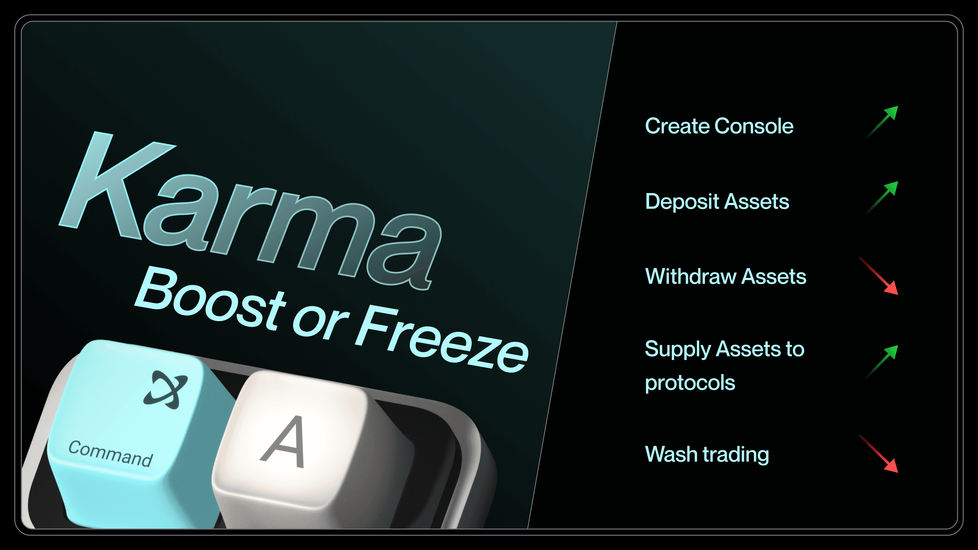 Karma is a reflection of your on-chain activity, calculated from every transaction and interaction you make with Console. Each transaction is a decisive action—positive actions boost your Karma , while negative actions trigger slashing events that can diminish your standing. Every move counts, shaping your KARMA and defining your impact.