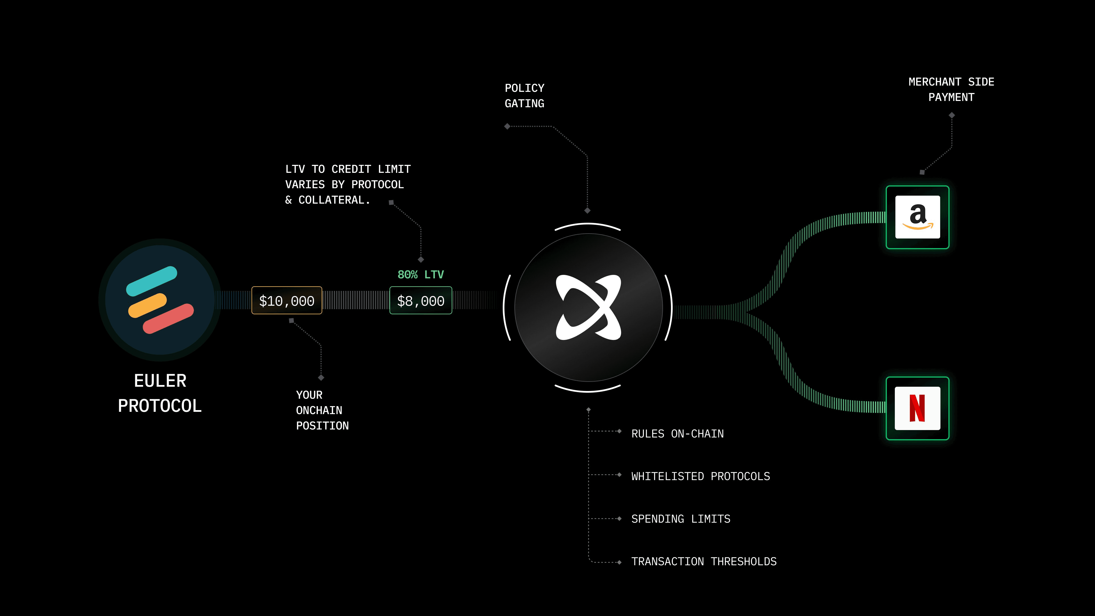 For the first time, your onchain collateral remains always productive, earning yield, securing loans right up to the moment you swipe. Your Aave or Euler Finance positions on Base and more chains automatically funds transactions, at checkout, in real-time, without touching your principal.