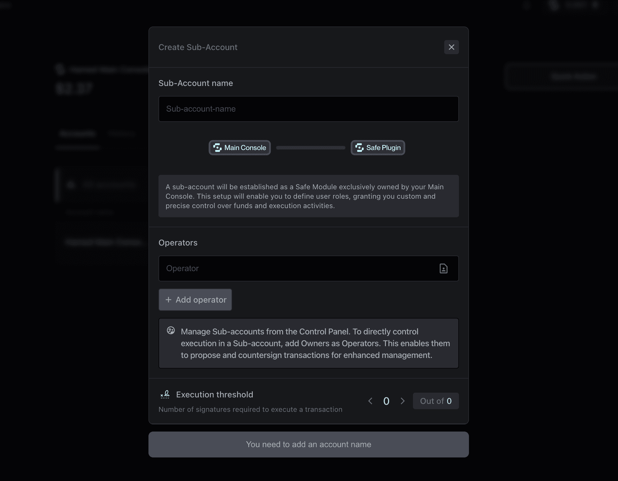 As such, the main Console can host several Sub-Accounts, which can be configured according to the actions and tasks required. This allows teams to create and join multiple Safe Accounts, improving delegation, control, and team collaboration.