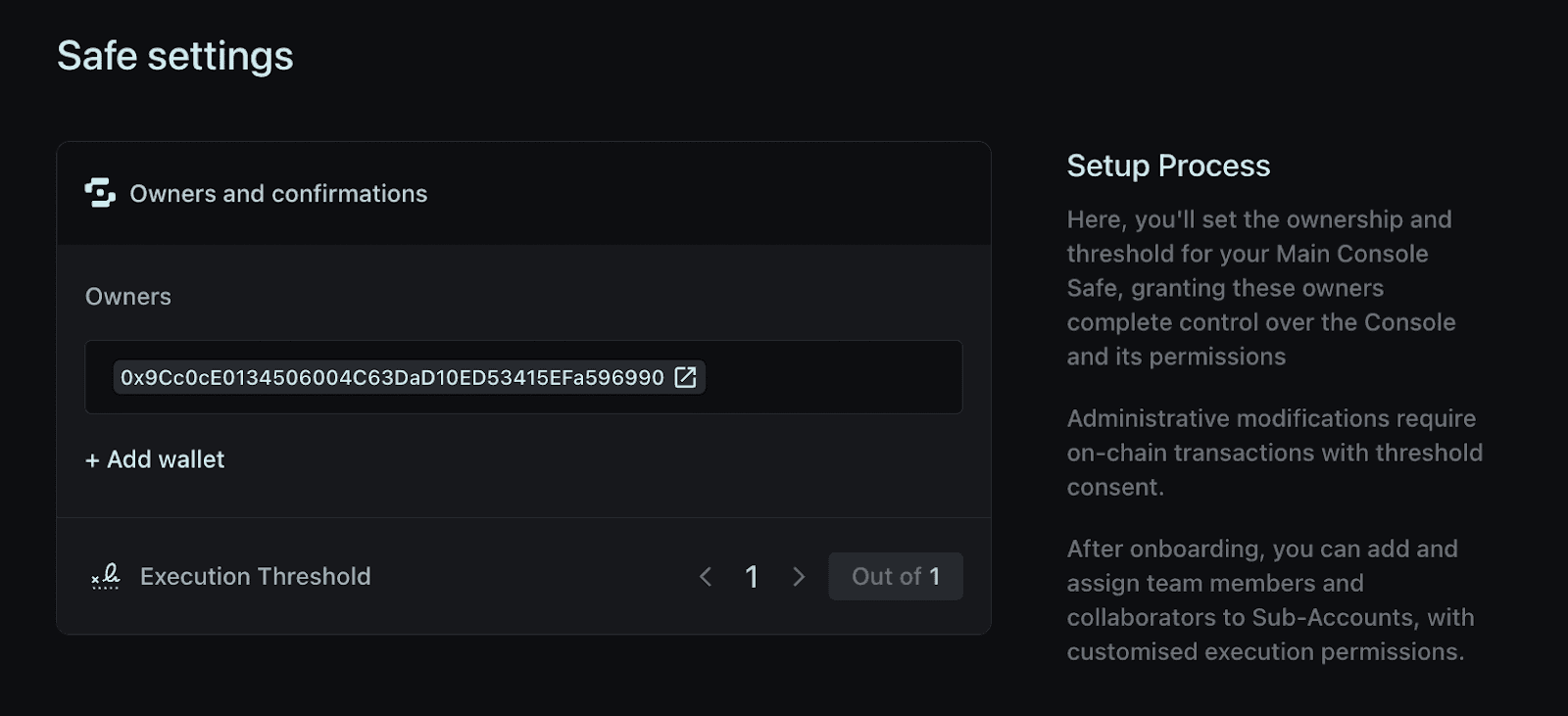 If you create a new Safe, you will then be able to set the owners and the execution threshold in advance. Bear in mind: this Safe will control all of the Sub-Accounts in the Console environment.