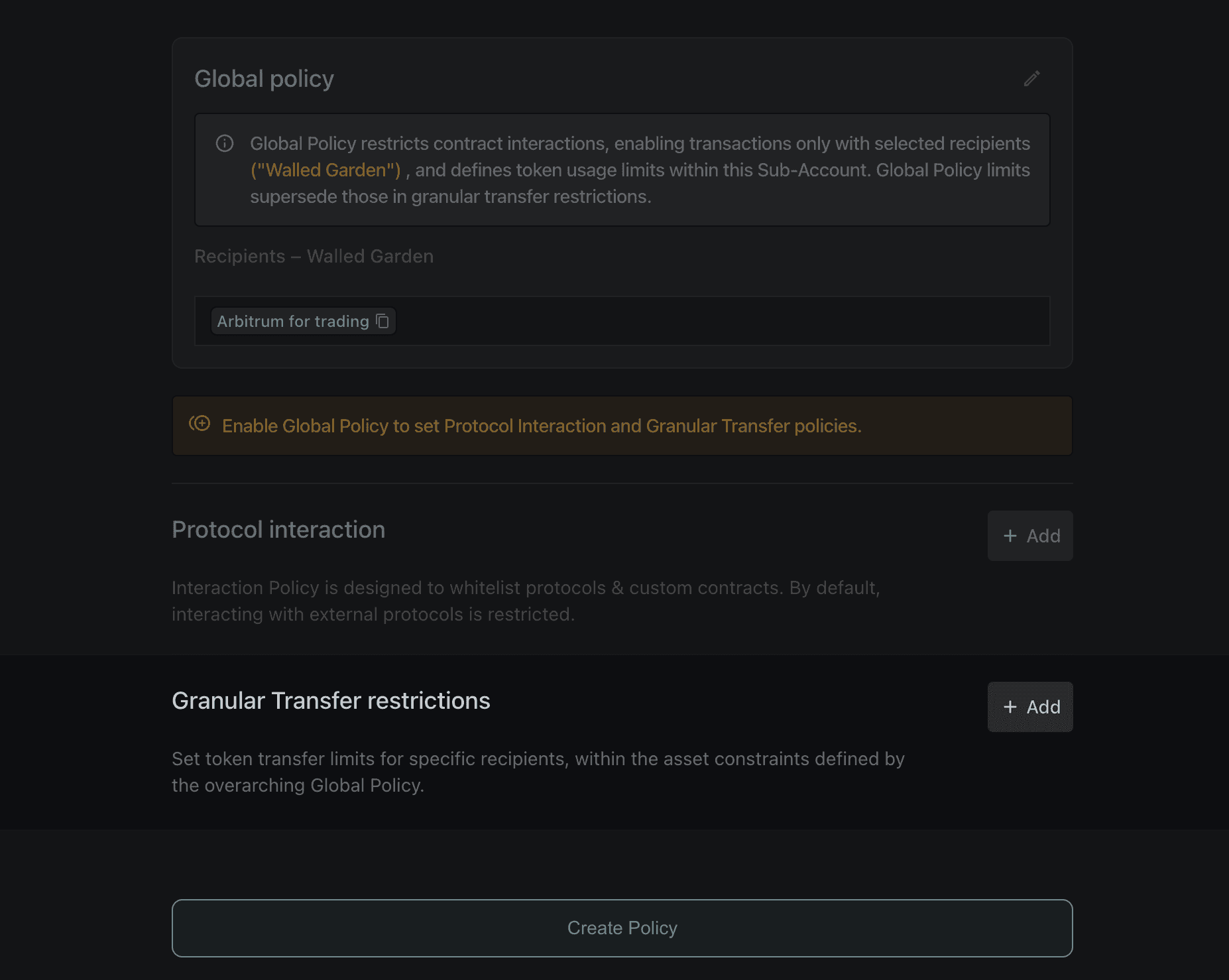 🔒 Global Policy. if activated, the Sub-Account in question can only send transactions to selected recipients, with specific limits for token usage. This means, for instance, that this Sub-Account can only send funds to the Main Console or to itself – but never to others. In case the Sub-Account operators tries to take funds out of their wallet, the transaction will automatically fail.